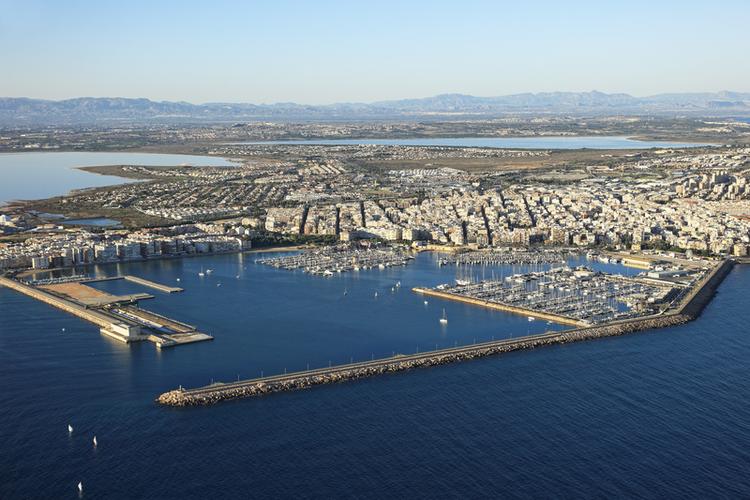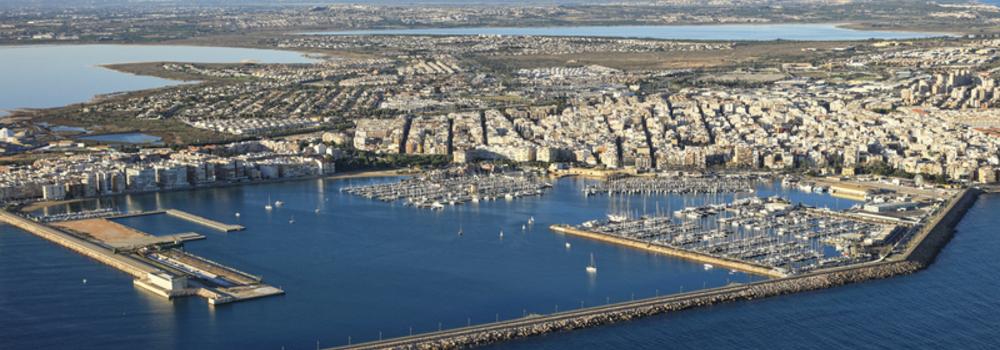 Port aménagé dans la partie Nord de Ensenada de Torrevieja. Deux brise-lames abritent le port : la digue du levant (Dique de Levante ou digue de l'Est), enracinée dans Punta de la Cornuda, et la contre-digue (Dique de Poniente), enracinée dans la Playa de Acequión.