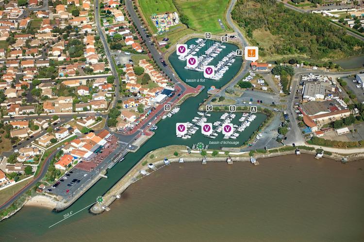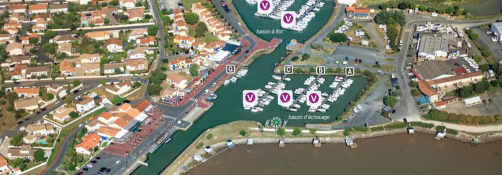 239 pl. et 12 visit. (< 10 m et tirant d'eau < 1,80 m) ; Bassins équipés de pontons flottants sur pieux ; Bassin d'échouage creusé à la cote +2 m et bassin à flot creusé à la cote +1,5 m. Hauteur d'eau minimum de 2 m dans le bassin à flot. Port s'envasant régulièrement.