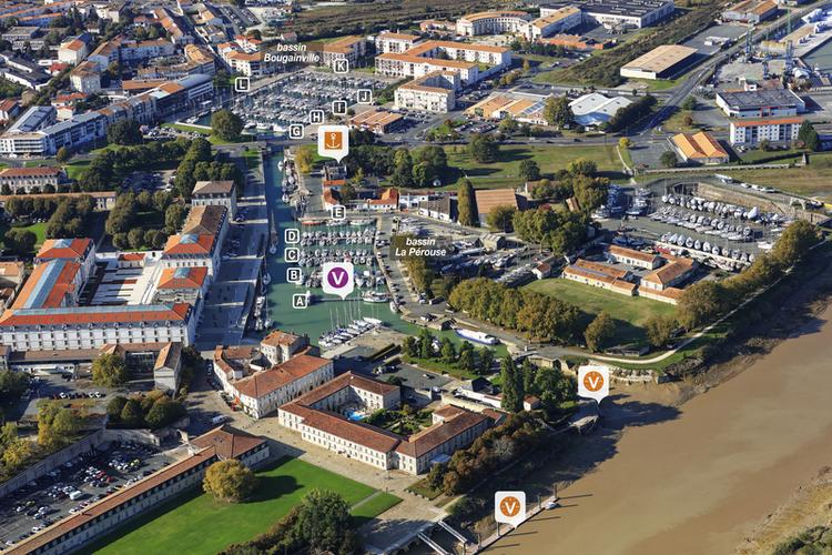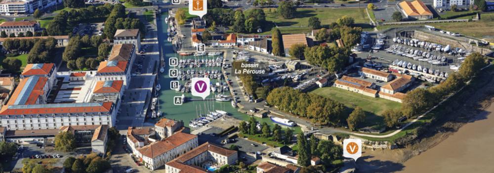Port de plaisance situé sur la rive droite de la rivière Charente. Le site se trouve à 2 M en amont du pont du Martrou, à 300 m en aval du port de commerce et à 100 m de la Corderie royale. L'accès est facile de jour par tout temps. Le port est abrité de tout vent sauf de l'W. Pas de réservation possible.