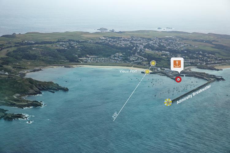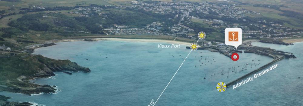 Accès : De jour : 2 amers alignés au 142° près de Saye Bay par l'extrémité immergée du brise-lames.