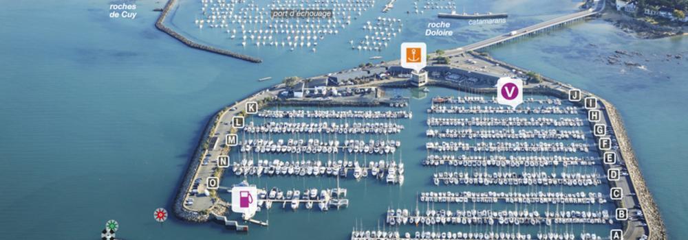 Port de plaisance en eau profonde situé à l'extrémité Est de la baie du Pouliguen, relié à la terre par un pont de 250 m, abrité de tout vent et protégé de la houle. Bassin de marée accessible par tout temps 24h/24. Accès limité par BM de VE pour forts TE.