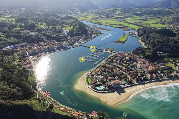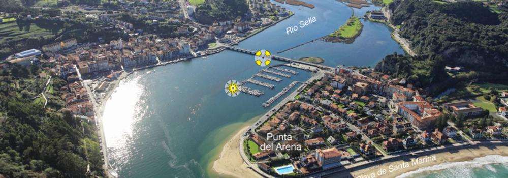 Accès : L'embouchure de la ría est facile à identifier : à l'E, le mont Corbero et, à l'W, le mont Somos (Fl(1+2)W.12s113m25M), dont les pointes forment, sur 800 m, la plage Santa Marina. Après avoir repéré les monts Somos et Corbero, naviguer suivant la médiane de ces deux collines jusqu'à ce que l'on puisse apercevoir la tête du quai et passer à environ 17 m pour éviter les quelques rochers clairsemés au pied de la pointe. Le courant de vidage est de 2 noeuds à l'heure à marée haute et atteint 5 à 6 noeuds en cas de crue de la rivière Sella. En morte-eau, il est de 1,5 nœud.