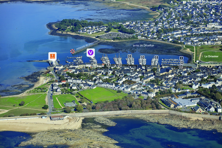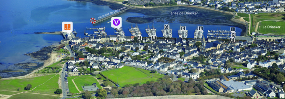Amarrage : Sur pontons flott. équipés. Port abri exceptionnel dans l'anse du Driasker draguée entre 2 et 4 m. Prévenir systématiquement sur le canal 9 à l'arrivée du bateau.