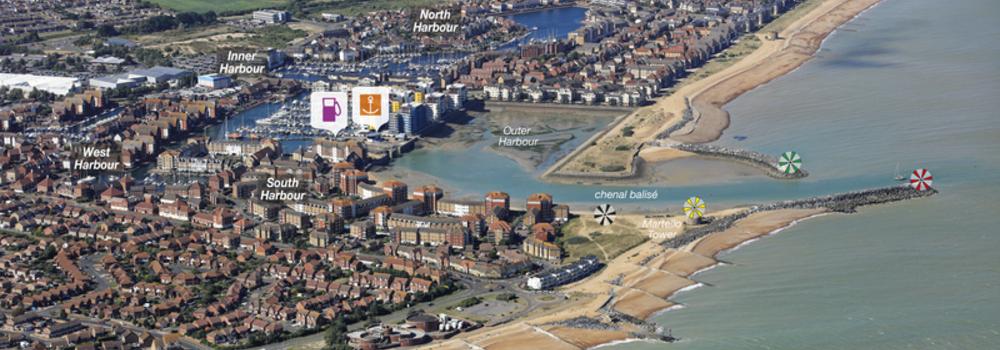 Feux d'entrée : Martello Tower Fl(3)W.15s12m7M ; (50°47,2' N - 000°19,7' E) Dir.Fl.WRG.5s4m1M.