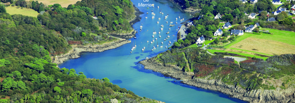 Accès : à la rivière Merrien : Large entrée, venant de l'E, arrondir la perche de la roche Bali, virer à la 2e perche et se diriger droit vers la large entrée de la rivière. Venant de l'W, arrondir la perche du Cochon. Seuil de sable dans l'entrée 0,60 m max. Entrée 2h après la BM en VE et presque à BM en ME avec un tirant d'eau de 1,20 m. De nuit : Avancer avec prudence dans le 004° à 009° (5°) du Dir.Q.R.26m7M (47°47,1' N - 003°39,0' W).