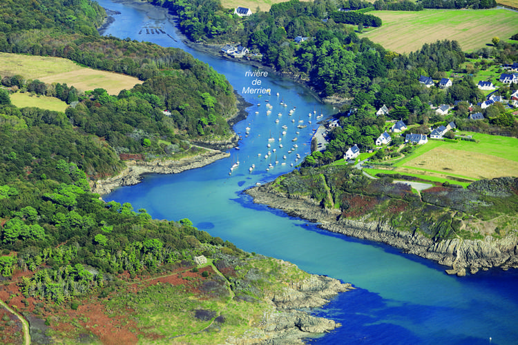 Bien protégé de tous les vents, le petit port de Merrien est caché derrière une pointe de lande et de bois.