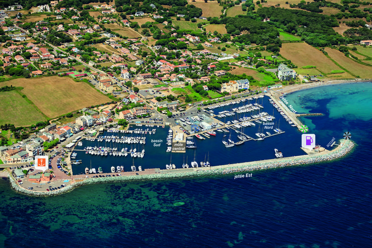 Accès : De jour : Facile. Port situé au sud de la pointe de la Coscia ; Passe d'entrée de 45 m de large, ouverte vers le N entre 2 jetées N et NE, profondeur de la passe 3,10 m - chenal d'entrée au port entre le 15/06 et le 15/09 ; Difficulté par forts vents N, NE à E.