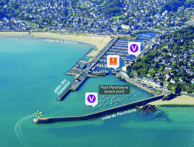 Amarrage : Bassins (sur pontons flottants uniquement) ; Avant-port (sur bouées d'échouage ou le long du quai de Penthièvre).